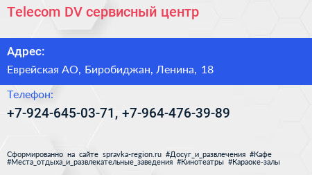 Telecom-DV, сервисный центр по адресу Еврейская АО, Биробиджан, Ленина, 18 в дальнейшем Организация, размещена в следующих категориях: