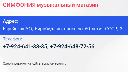 СИМФОНИЯ, музыкальный магазин по адресу Еврейская АО, Биробиджан, проспект 60-летия СССР, 3 в дальнейшем Организация, размещена в следующих категориях: