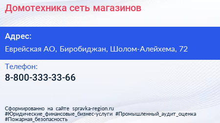 Домотехника, сеть магазинов по адресу Еврейская АО, Биробиджан, Шолом-Алейхема, 72 в дальнейшем Организация, размещена в следующих категориях: