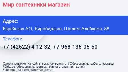 Мир сантехники, магазин по адресу Еврейская АО, Биробиджан, Шолом-Алейхема, 88 в дальнейшем Организация, размещена в следующих категориях: