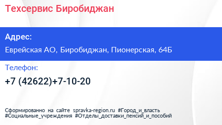 Техсервис-Биробиджан по адресу Еврейская АО, Биробиджан, Пионерская, 64Б в дальнейшем Организация, размещена в следующих категориях: