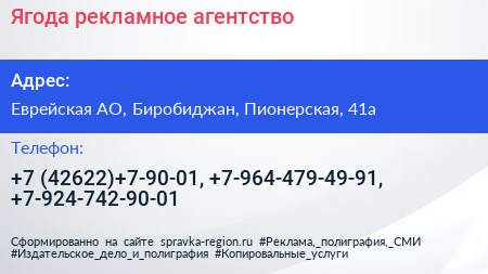 Ягода, рекламное агентство по адресу Еврейская АО, Биробиджан, Пионерская, 41а в дальнейшем Организация, размещена в следующих категориях: