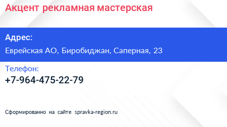 Акцент, рекламная мастерская по адресу Еврейская АО, Биробиджан, Саперная, 23 в дальнейшем Организация, размещена в следующих категориях: