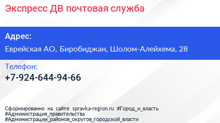 Экспресс ДВ, почтовая служба по адресу Еврейская АО, Биробиджан, Шолом-Алейхема, 28 в дальнейшем Организация, размещена в следующих категориях: