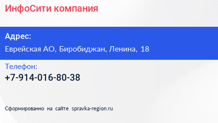 Для связи с организацией воспользуйтесь номером телефона: +7-914-016-80-38. Пн: c 09:00-13:00, Вт: c 09:00-13:00, Ср: c 09:00-13:00, Чт: c 09:00-13:00, Пт: c 09:00-13:00, Сб: выходной, Вс: выходной, вы можете обратиться в эту организацию.