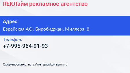 REKЛайм, рекламное агентство по адресу Еврейская АО, Биробиджан, Миллера, 8 в дальнейшем Организация, размещена в следующих категориях: