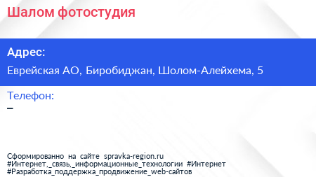Шалом, фотостудия по адресу Еврейская АО, Биробиджан, Шолом-Алейхема, 5 в дальнейшем Организация, размещена в следующих категориях: