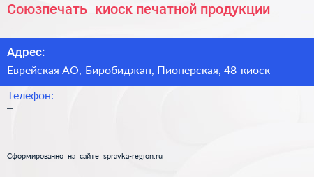 Союзпечать+, киоск печатной продукции по адресу Еврейская АО, Биробиджан, Пионерская, 48 киоск в дальнейшем Организация, размещена в следующих категориях: