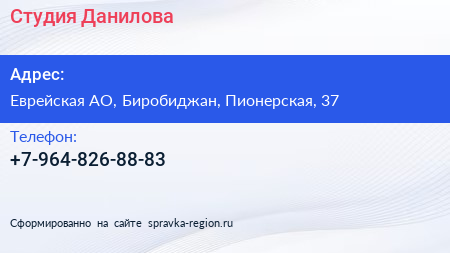 Студия Данилова по адресу Еврейская АО, Биробиджан, Пионерская, 37 в дальнейшем Организация, размещена в следующих категориях: