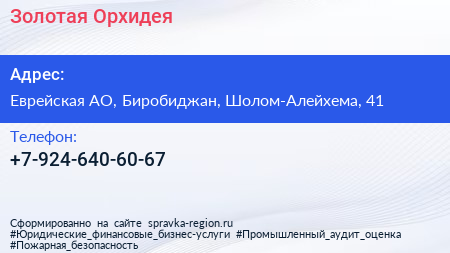 Золотая Орхидея по адресу Еврейская АО, Биробиджан, Шолом-Алейхема, 41 в дальнейшем Организация, размещена в следующих категориях: