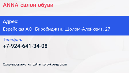 ANNA, салон обуви по адресу Еврейская АО, Биробиджан, Шолом-Алейхема, 27 в дальнейшем Организация, размещена в следующих категориях: