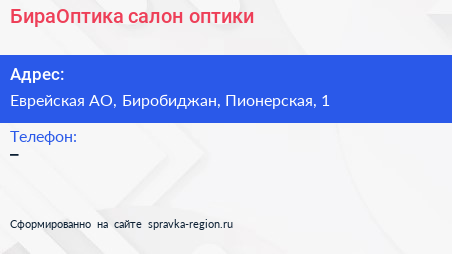 БираОптика, салон оптики по адресу Еврейская АО, Биробиджан, Пионерская, 1 в дальнейшем Организация, размещена в следующих категориях: