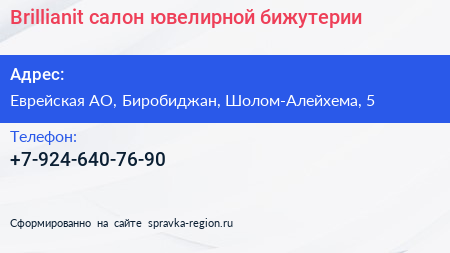 Brillianit, салон ювелирной бижутерии по адресу Еврейская АО, Биробиджан, Шолом-Алейхема, 5 в дальнейшем Организация, размещена в следующих категориях: