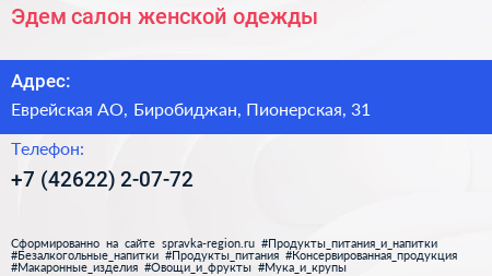 Эдем, салон женской одежды по адресу Еврейская АО, Биробиджан, Пионерская, 31 в дальнейшем Организация, размещена в следующих категориях:
