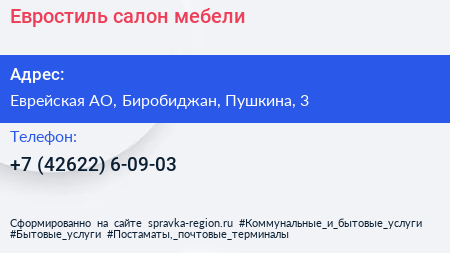 Евростиль, салон мебели по адресу Еврейская АО, Биробиджан, Пушкина, 3 в дальнейшем Организация, размещена в следующих категориях: