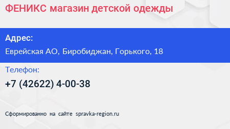ФЕНИКС, магазин детской одежды по адресу Еврейская АО, Биробиджан, Горького, 18 в дальнейшем Организация, размещена в следующих категориях: