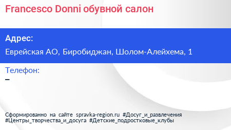 Francesco Donni, обувной салон по адресу Еврейская АО, Биробиджан, Шолом-Алейхема, 1 в дальнейшем Организация, размещена в следующих категориях: