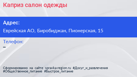 Каприз, салон одежды по адресу Еврейская АО, Биробиджан, Пионерская, 15 в дальнейшем Организация, размещена в следующих категориях: