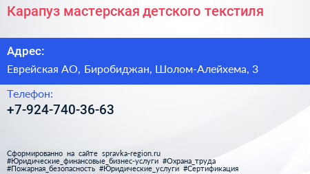 Карапуз, мастерская детского текстиля по адресу Еврейская АО, Биробиджан, Шолом-Алейхема, 3 в дальнейшем Организация, размещена в следующих категориях: