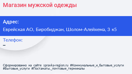 Магазин мужской одежды по адресу Еврейская АО, Биробиджан, Шолом-Алейхема, 3 к5 в дальнейшем Организация, размещена в следующих категориях:
