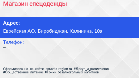 Магазин спецодежды по адресу Еврейская АО, Биробиджан, Калинина, 10а в дальнейшем Организация, размещена в следующих категориях: