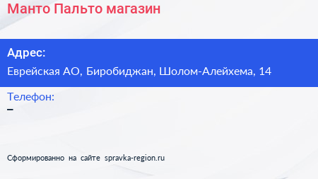 Манто-Пальто, магазин по адресу Еврейская АО, Биробиджан, Шолом-Алейхема, 14 в дальнейшем Организация, размещена в следующих категориях:
