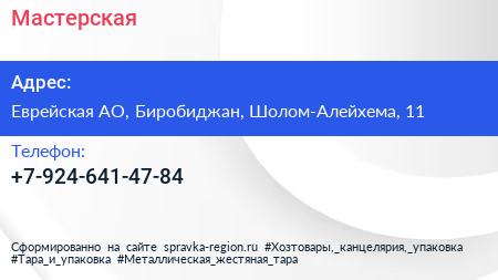 Мастерская по адресу Еврейская АО, Биробиджан, Шолом-Алейхема, 11 в дальнейшем Организация, размещена в следующих категориях: