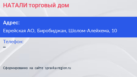 НАТАЛИ, торговый дом по адресу Еврейская АО, Биробиджан, Шолом-Алейхема, 10 в дальнейшем Организация, размещена в следующих категориях: