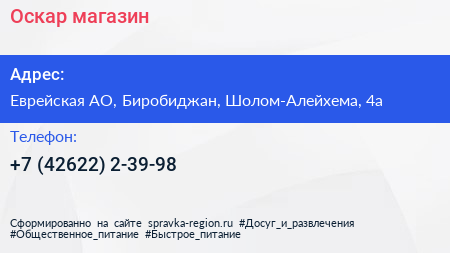 Оскар, магазин по адресу Еврейская АО, Биробиджан, Шолом-Алейхема, 4а в дальнейшем Организация, размещена в следующих категориях: