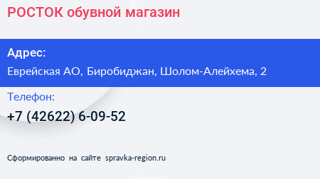 РОСТОК, обувной магазин по адресу Еврейская АО, Биробиджан, Шолом-Алейхема, 2 в дальнейшем Организация, размещена в следующих категориях: