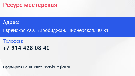 Ресурс, мастерская по адресу Еврейская АО, Биробиджан, Пионерская, 80 к1 в дальнейшем Организация, размещена в следующих категориях: