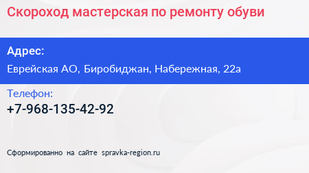 Скороход, мастерская по ремонту обуви по адресу Еврейская АО, Биробиджан, Набережная, 22а в дальнейшем Организация, размещена в следующих категориях: