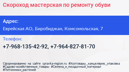 Скороход, мастерская по ремонту обуви по адресу Еврейская АО, Биробиджан, Комсомольская, 7 в дальнейшем Организация, размещена в следующих категориях: