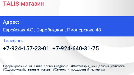 TALIS, магазин по адресу Еврейская АО, Биробиджан, Пионерская, 48 в дальнейшем Организация, размещена в следующих категориях: