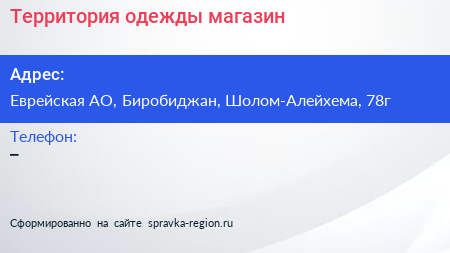 Территория одежды, магазин по адресу Еврейская АО, Биробиджан, Шолом-Алейхема, 78г в дальнейшем Организация, размещена в следующих категориях: