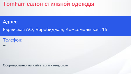 TomFarr, салон стильной одежды по адресу Еврейская АО, Биробиджан, Комсомольская, 16 в дальнейшем Организация, размещена в следующих категориях: