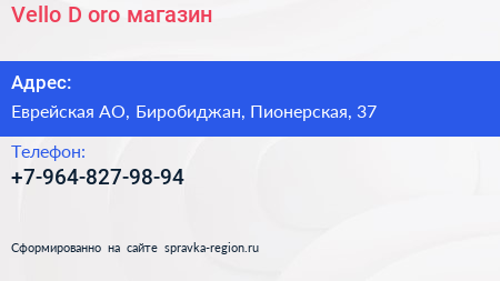 Vello D`oro, магазин по адресу Еврейская АО, Биробиджан, Пионерская, 37 в дальнейшем Организация, размещена в следующих категориях: