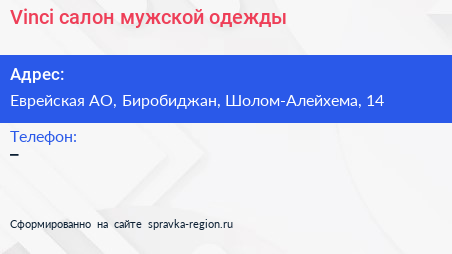 Vinci, салон мужской одежды по адресу Еврейская АО, Биробиджан, Шолом-Алейхема, 14 в дальнейшем Организация, размещена в следующих категориях: