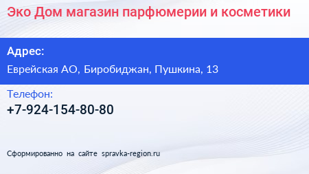 Эко Дом, магазин парфюмерии и косметики по адресу Еврейская АО, Биробиджан, Пушкина, 13 в дальнейшем Организация, размещена в следующих категориях: