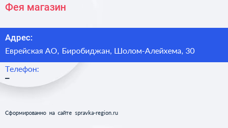 Фея, магазин по адресу Еврейская АО, Биробиджан, Шолом-Алейхема, 30 в дальнейшем Организация, размещена в следующих категориях: