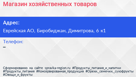 Магазин хозяйственных товаров по адресу Еврейская АО, Биробиджан, Димитрова, 6 к1 в дальнейшем Организация, размещена в следующих категориях: