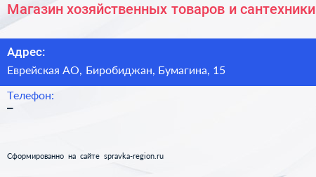 Магазин хозяйственных товаров и сантехники по адресу Еврейская АО, Биробиджан, Бумагина, 15 в дальнейшем Организация, размещена в следующих категориях: