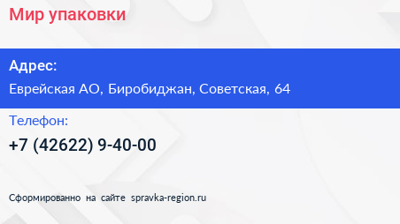 Мир упаковки по адресу Еврейская АО, Биробиджан, Советская, 64 в дальнейшем Организация, размещена в следующих категориях:
