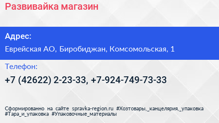 Развивайка, магазин по адресу Еврейская АО, Биробиджан, Комсомольская, 1 в дальнейшем Организация, размещена в следующих категориях: