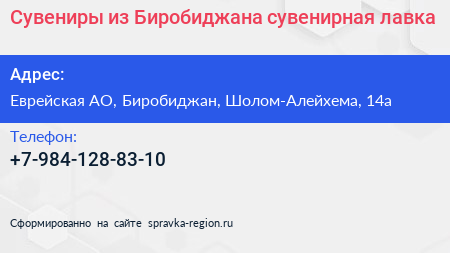 Сувениры из Биробиджана, сувенирная лавка по адресу Еврейская АО, Биробиджан, Шолом-Алейхема, 14а в дальнейшем Организация, размещена в следующих категориях: