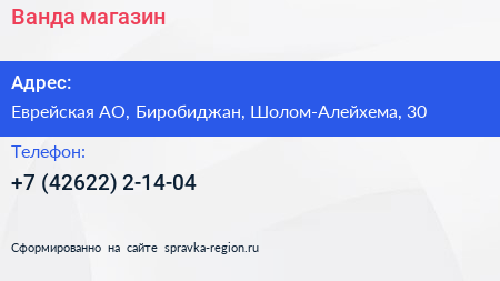 Ванда, магазин по адресу Еврейская АО, Биробиджан, Шолом-Алейхема, 30 в дальнейшем Организация, размещена в следующих категориях: