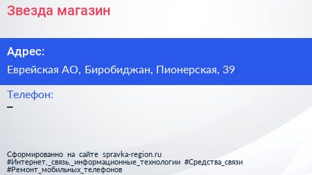 Звезда, магазин по адресу Еврейская АО, Биробиджан, Пионерская, 39 в дальнейшем Организация, размещена в следующих категориях: