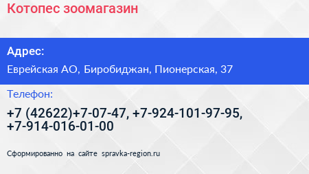 Котопес, зоомагазин по адресу Еврейская АО, Биробиджан, Пионерская, 37 в дальнейшем Организация, размещена в следующих категориях: