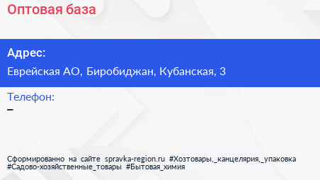 Оптовая база по адресу Еврейская АО, Биробиджан, Кубанская, 3 в дальнейшем Организация, размещена в следующих категориях: