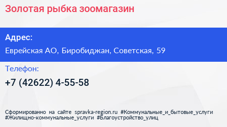 Золотая рыбка, зоомагазин по адресу Еврейская АО, Биробиджан, Советская, 59 в дальнейшем Организация, размещена в следующих категориях: